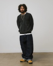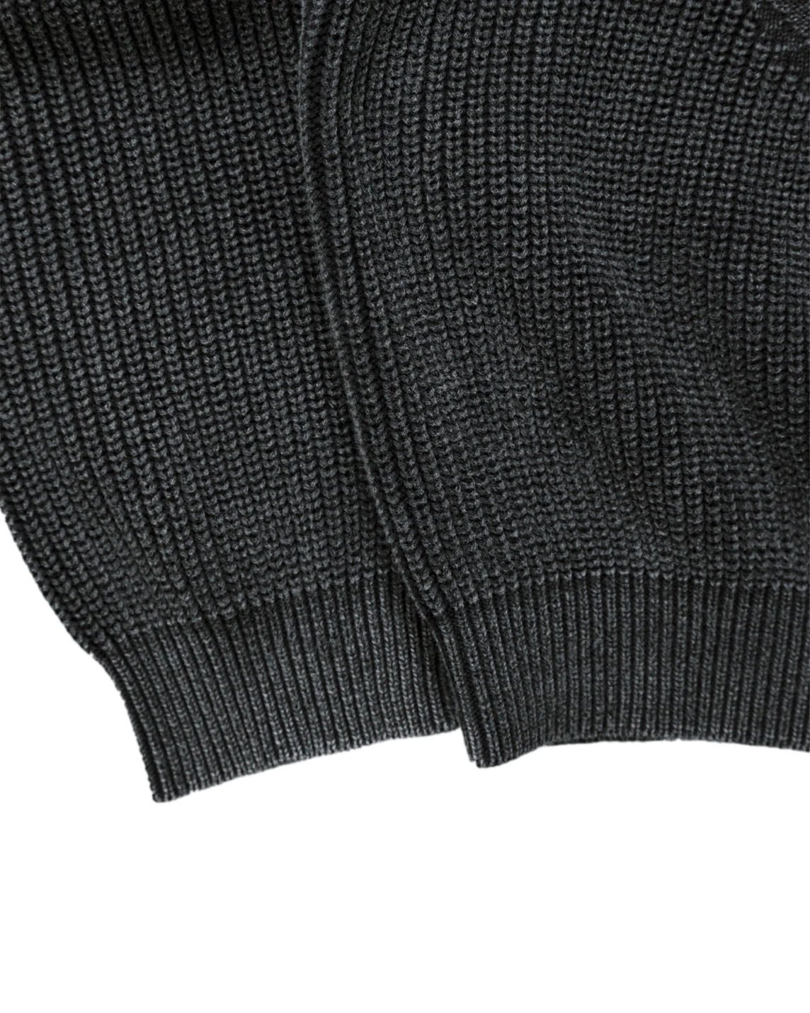 7-gauge long-staple cotton sweater knit in a half-cardigan stitch with reverse-stitch bone artwork creating a three-dimensional effect. Finished with an acid wash on the black yarns for added depth and character.